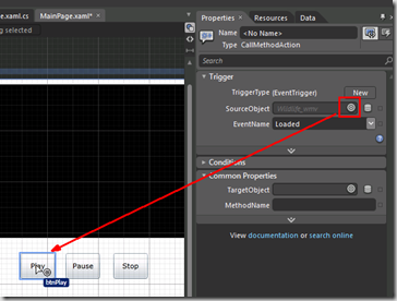 - Asserts-> Behaviors->CallMethodAction,將CallMethodAction Behavior拖曳到設計畫面MediaElement上方放開