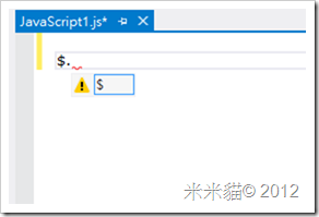 在Visual Studio 2012撰寫 ASP.NET MVC 專案的JavaScript時,預設會認識jQuery,因此當你輸入$號時,馬上會出現IntelliSense: